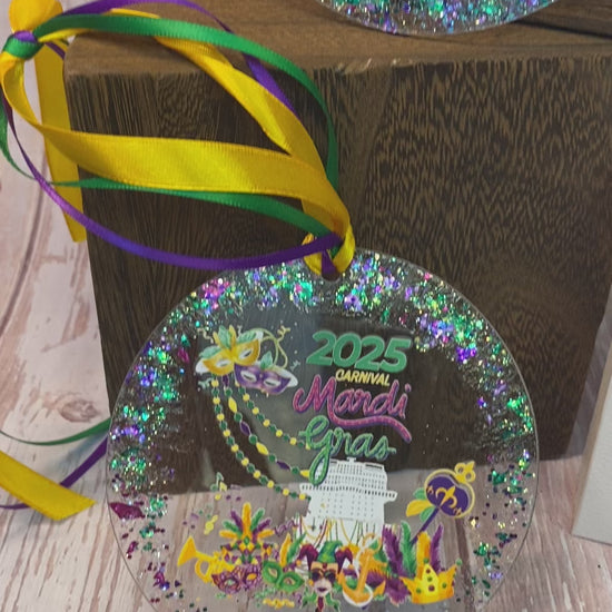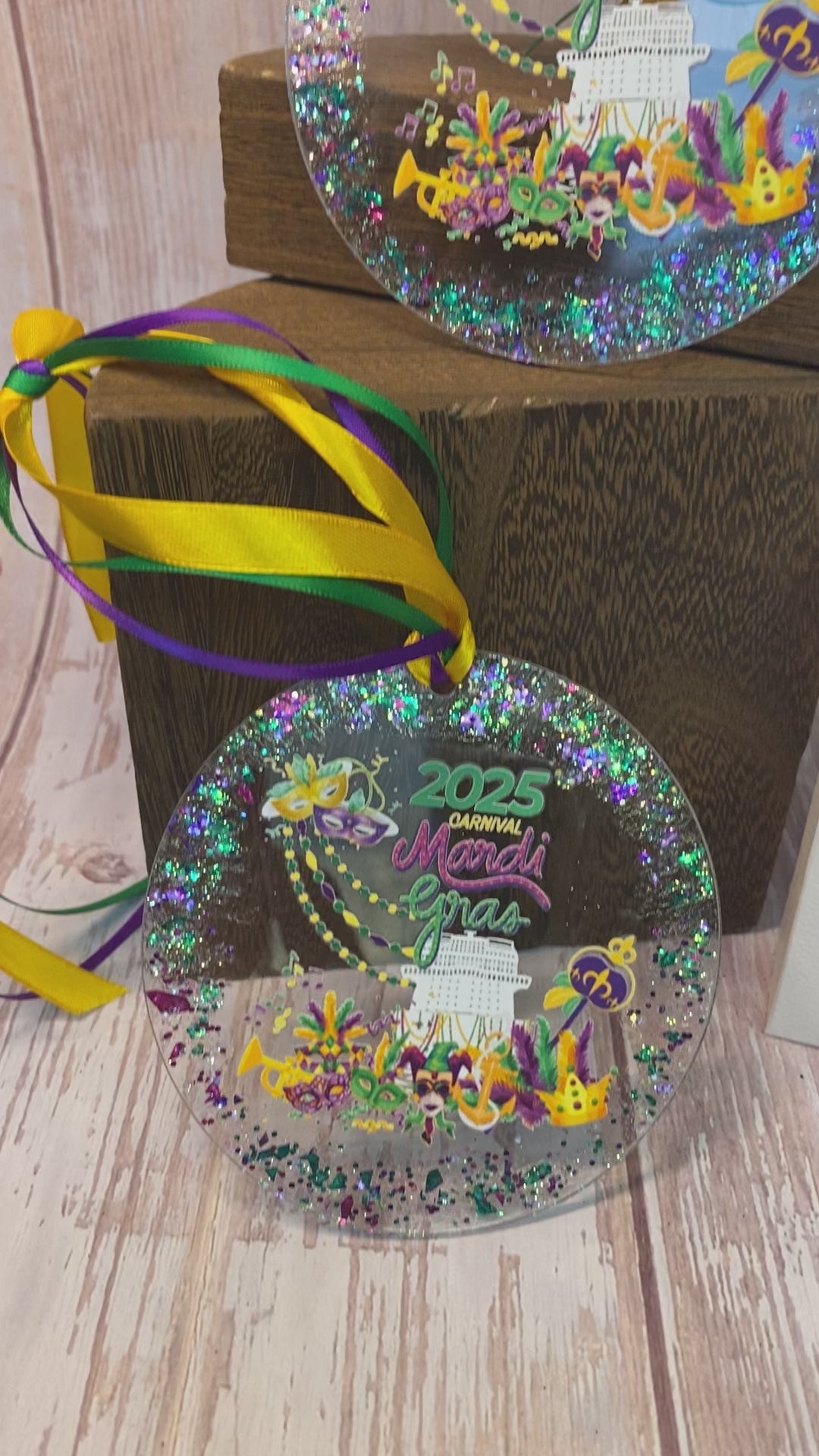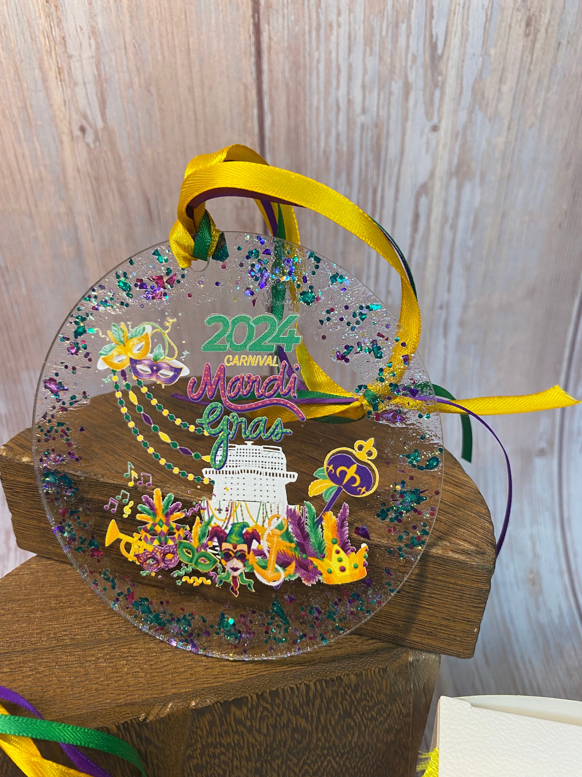 4” Acrylic Clear Round Ornament featuring Carnival Mardi Greas design with glitter/Sparkle border with ribbon loop