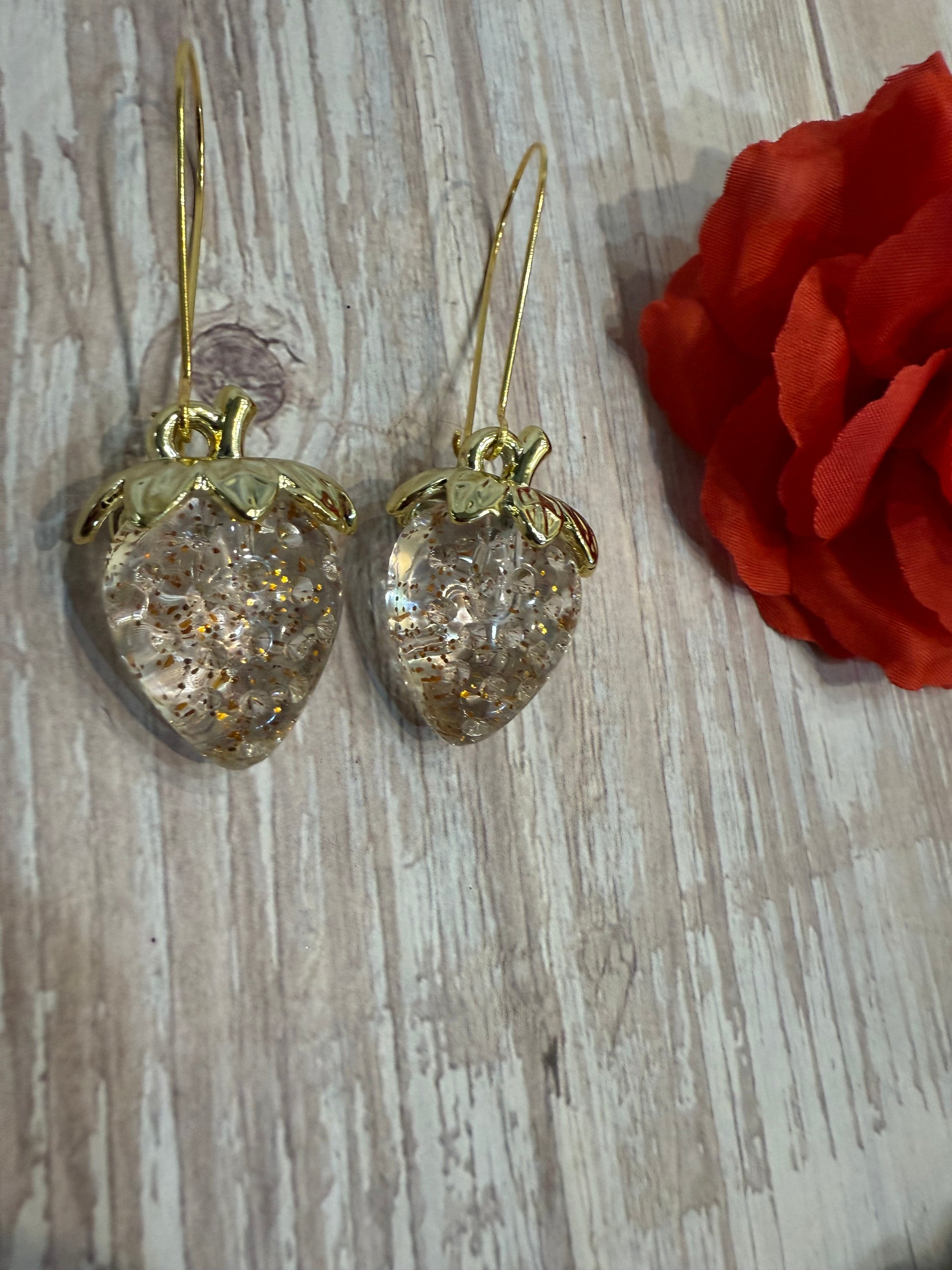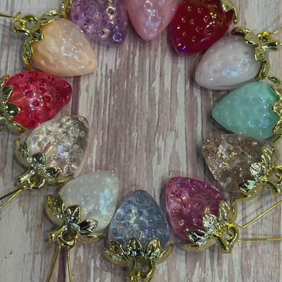 Sweet and stylish, these handmade iridescent strawberry earrings are perfect for adding a pop of fruity fun to any outfit! Each pair features beautifully crafted acrylic strawberries with a stunning iridescent finish that catches the light beautifully. The realistic strawberry design includes detailed gold-tone leafy tops and textured berry surfaces with seed details.