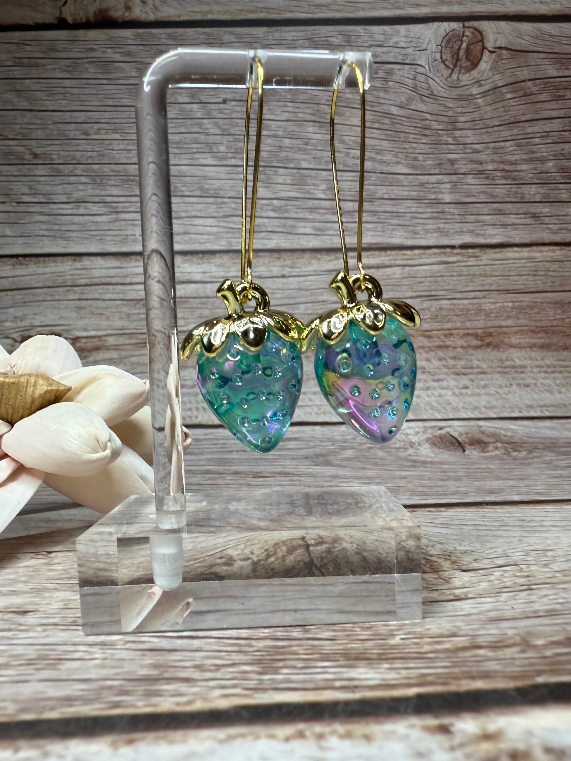Iridescent Strawberry Earrings - Acrylic Fruit Earrings on French Hooks - Handmade Kawaii Jewelry, Summer Fruit Colorful Strawberry Earrings