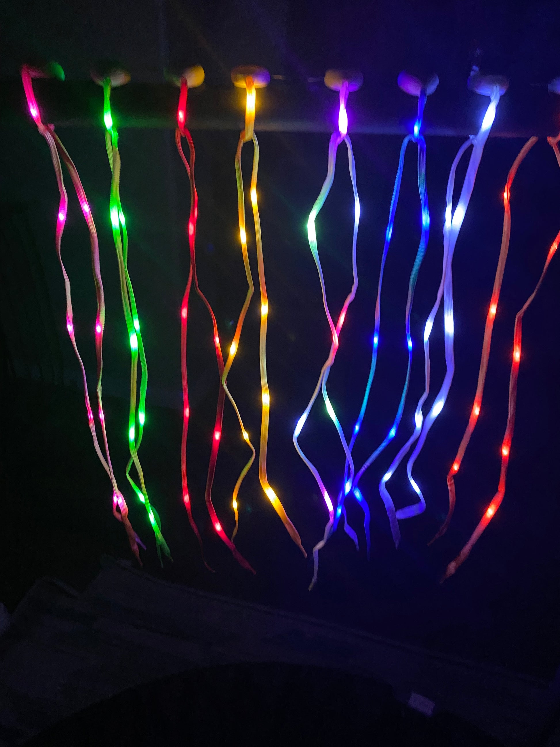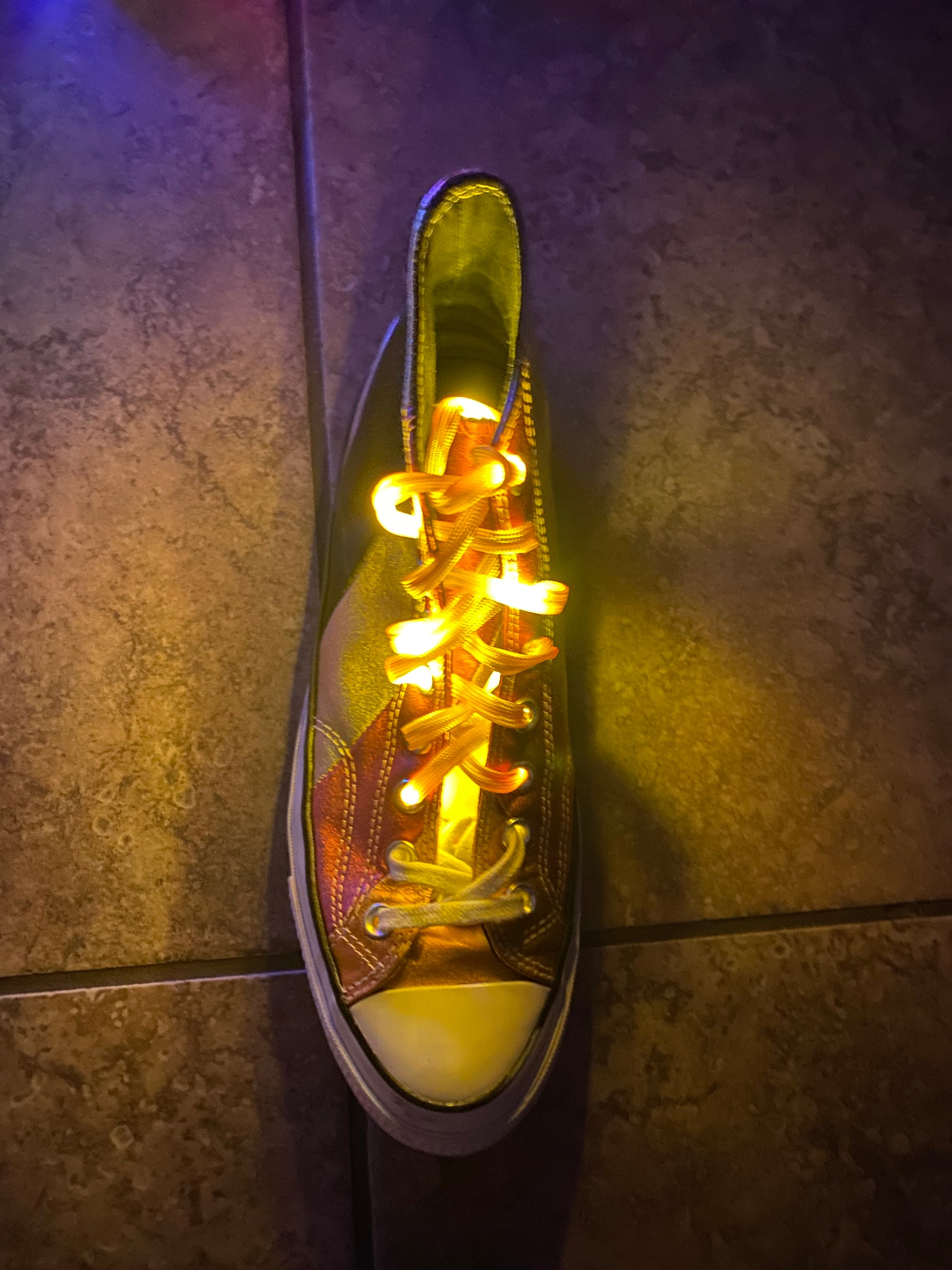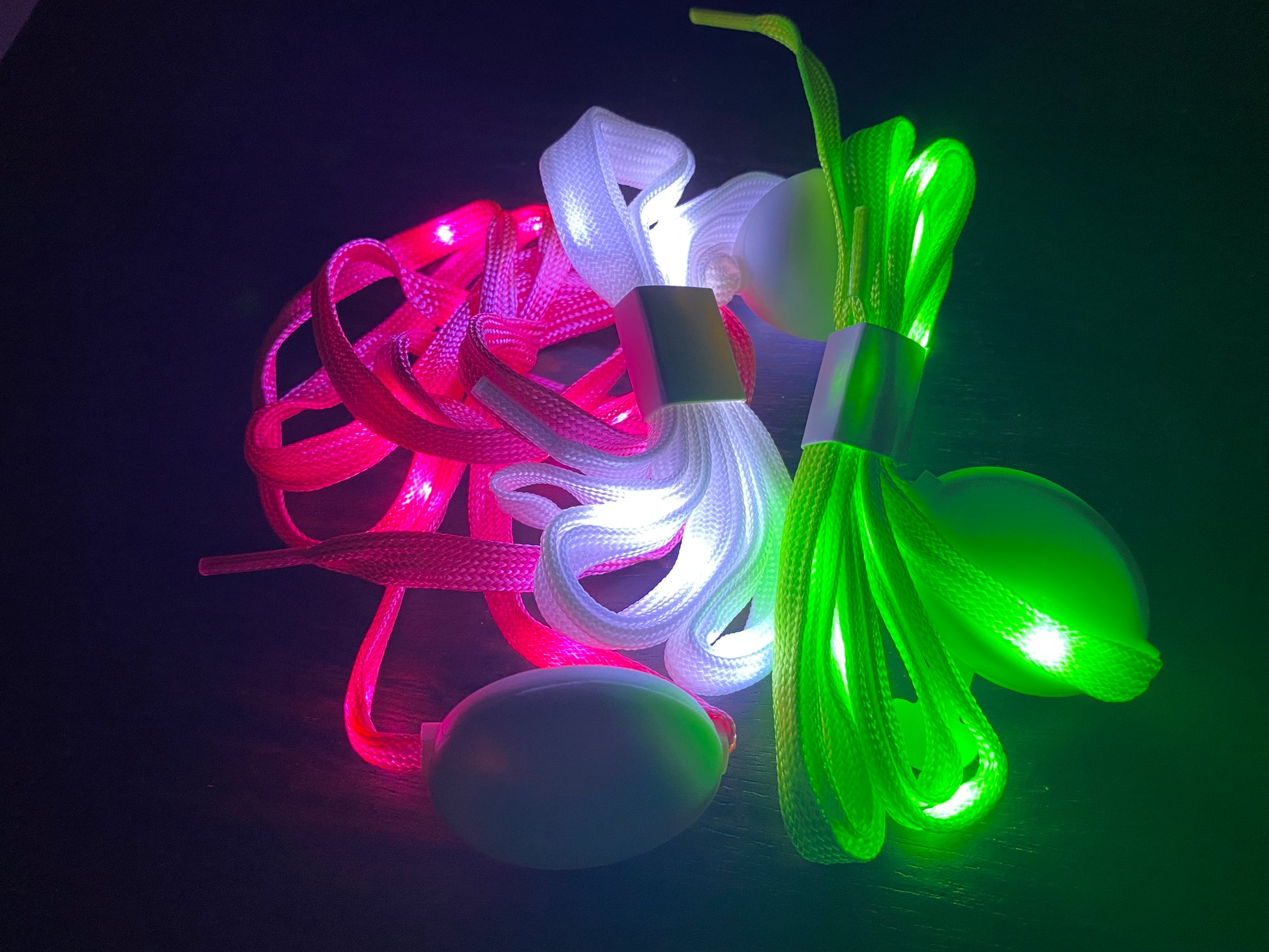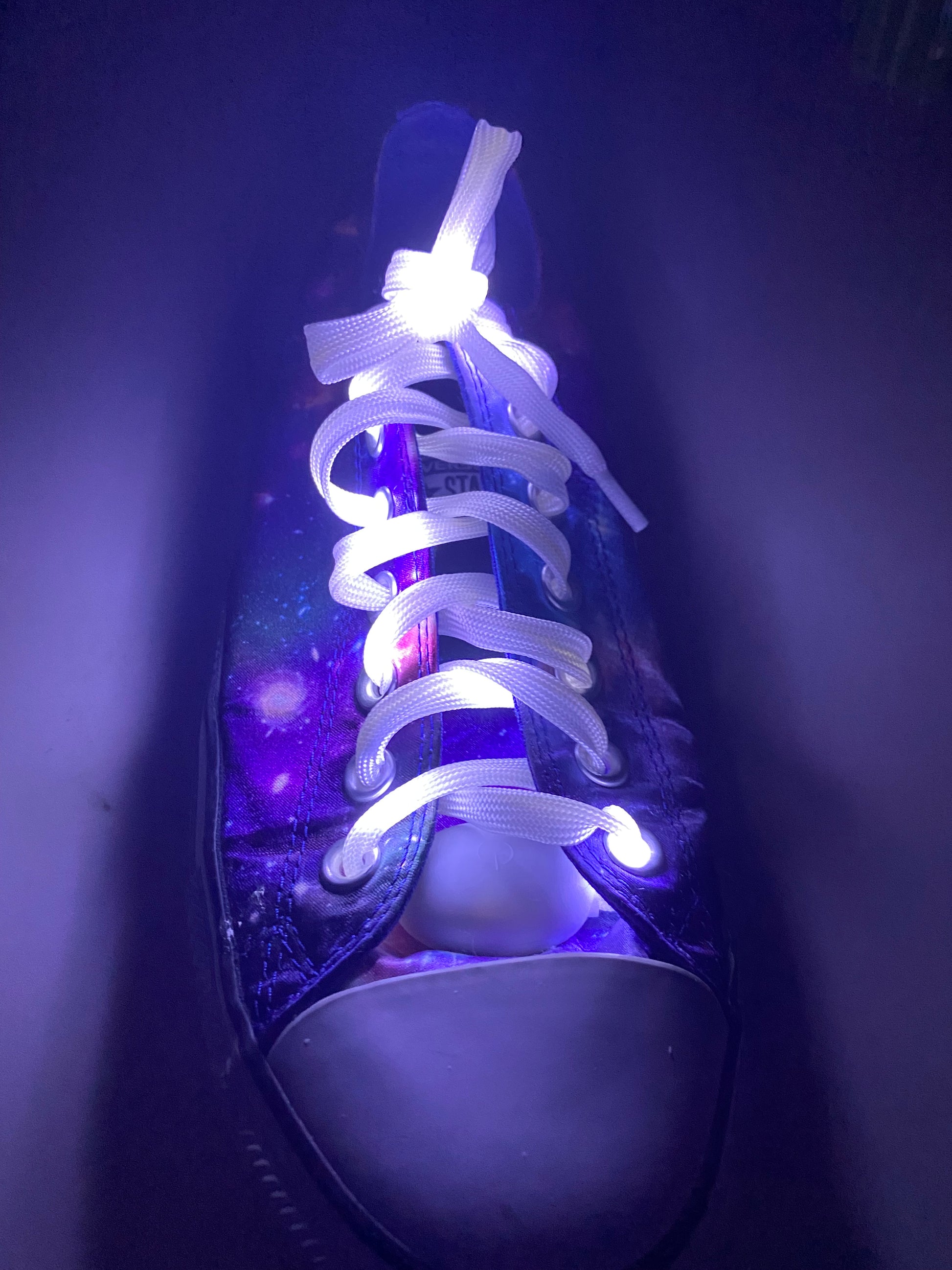 - Standard 48" shoelace (24" each side connected by a battery pack in the middle)