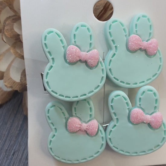 These pastel bunny hairclips are an adorable hair accessory for Spring. Add a touch of whimsy to your or your little one's spring wardrobe with these adorable pastel bunny hairclips. Each clip features a charming bunny design adorned with a glitter bow accent, perfect for Easter celebrations and everyday spring outings. Crafted with care, these hairclips securely hold hair in place while adding a splash of color and sparkle. Ideal for Easter basket gifts, party favors, or just to make your child feel extra special!