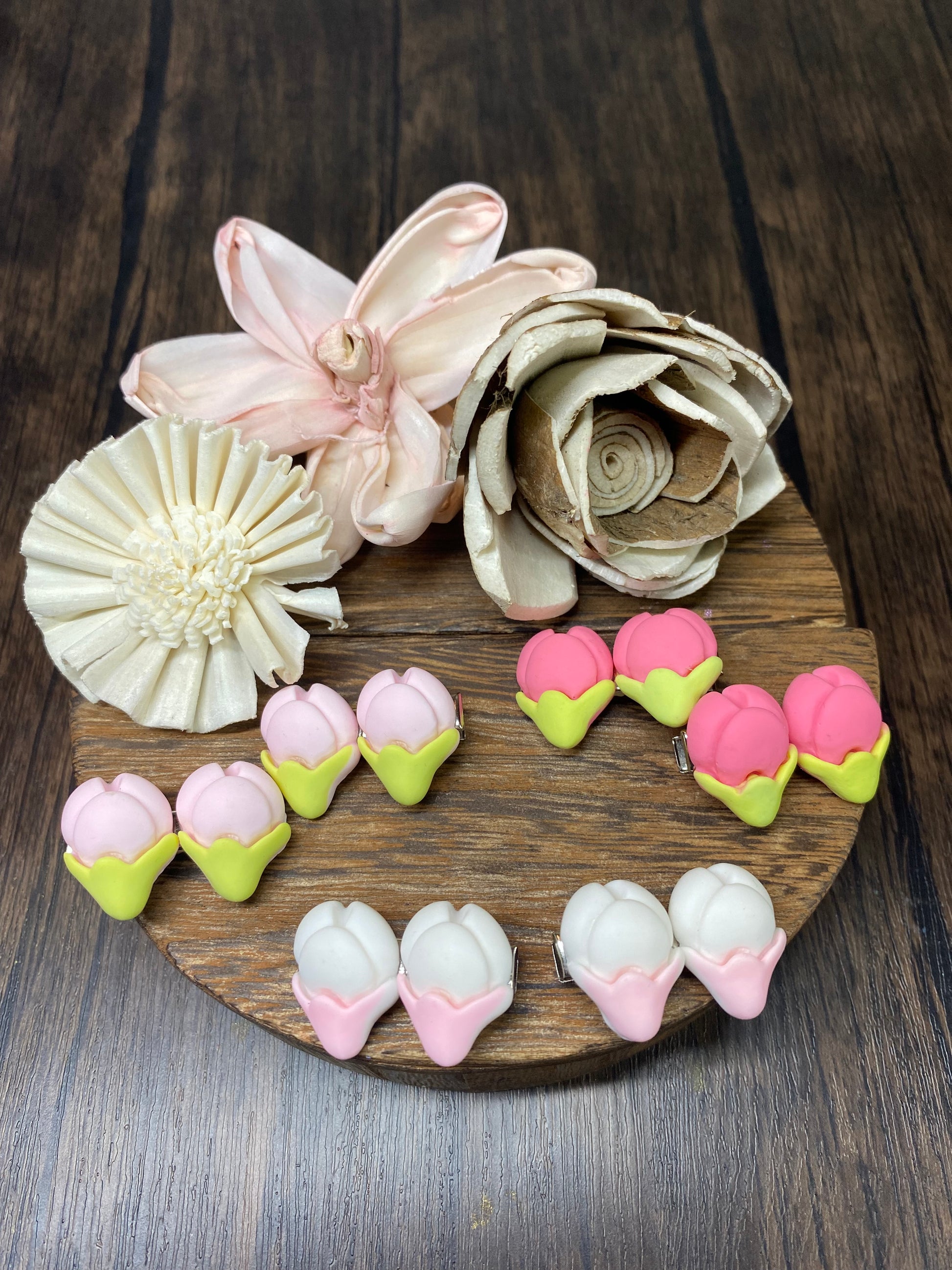These budding tulips are perfect for Spring! Each order comes with two clips clips have two tulips affixed on an alloy alligator clip. Available in rose pink, light pink, and white.